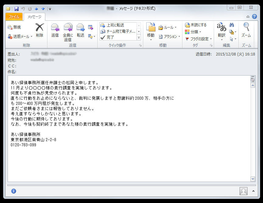 「あい探偵」と私どもの顧問弁護士を悪用したメールが出回ています。